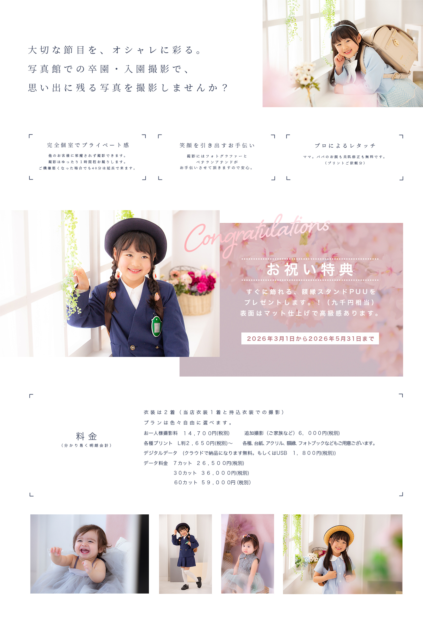 思い入れのある小物たちと大切な記念写真これから始まる新生活にドキドキ、ワクワクなお子様の表情やいきいきとした動きのある写真等をお撮りいたします。